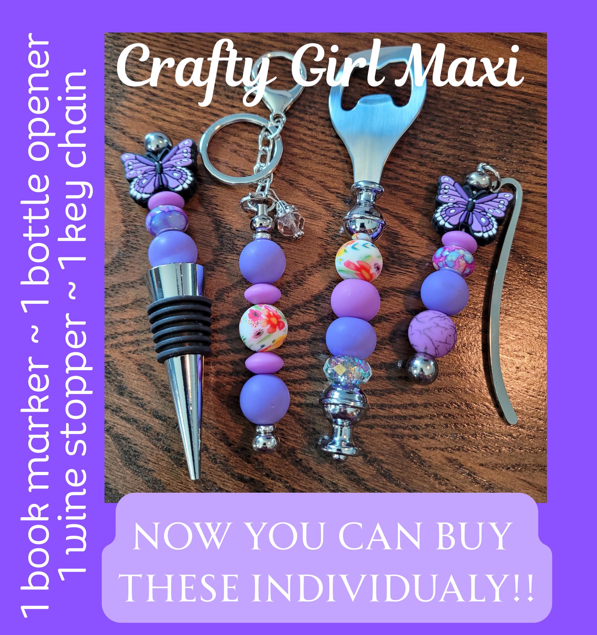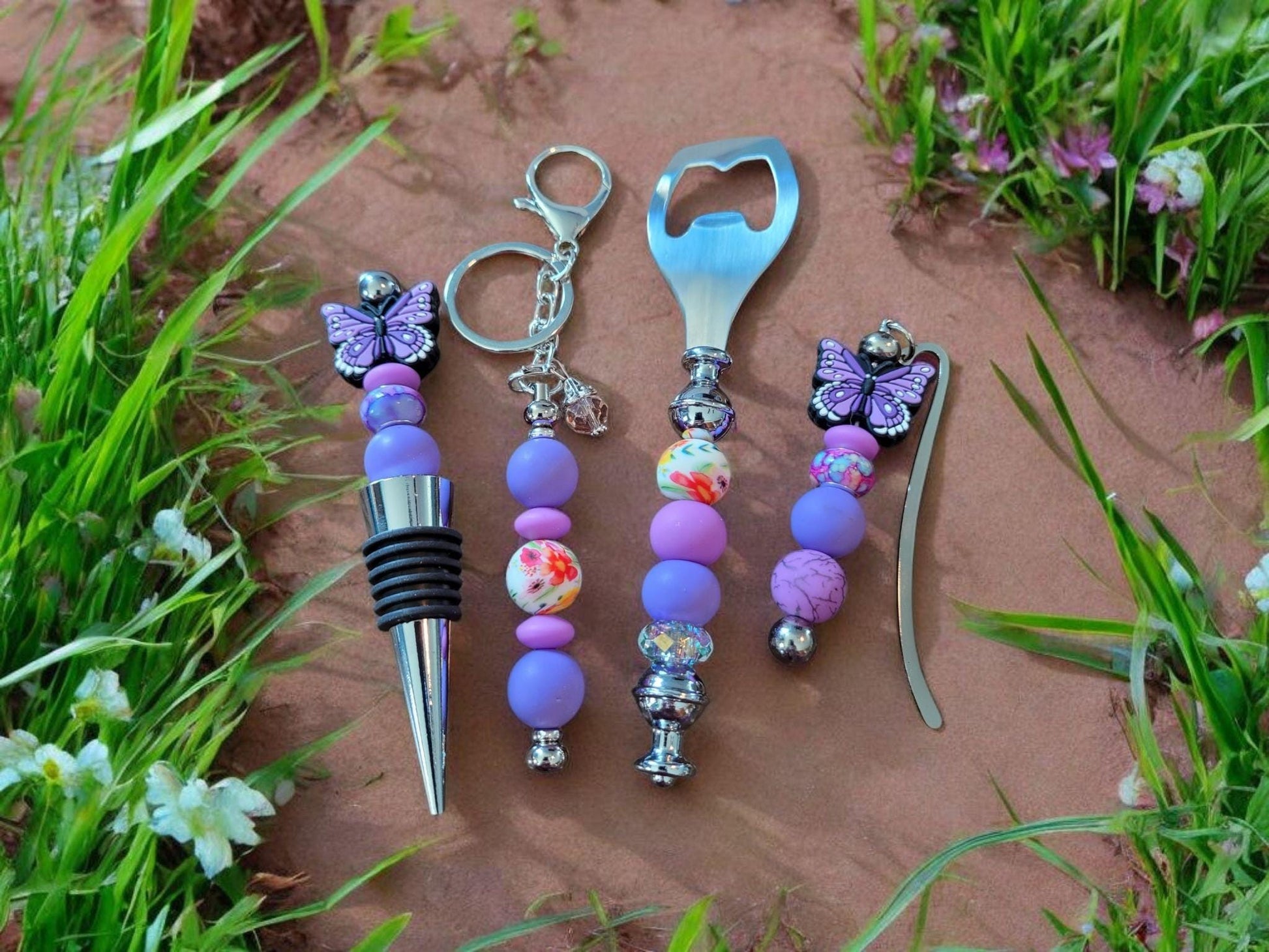 Get ready to elevate your cozy weekend vibes with this beaded gift set designed to pair perfectly with your favorite journal or a good book. Featuring a chic key ring, a handy book marker, a stylish wine stopper, and a bottle opener, this set brings together practical fun and thoughtful craftsmanship like no other. This is a butterfly themed silicone beaded gift set that includes, beaded bottle opener, beaded key ring, beaded book marker, beaded wine stopper.